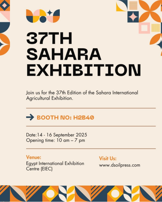 鄭州鼎盛機(jī)械有限公司,將于2025年9月14至16日在埃及國(guó)際展覽中心,第37屆撒哈拉國(guó)際農(nóng)業(yè)展覽會(huì)參展,和各國(guó)友人交流分享榨油機(jī)各種知識(shí)。